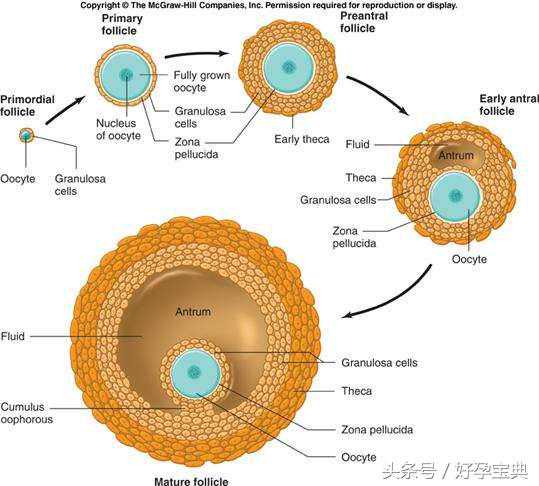 在垂体促性腺激素作用下,卵泡开始生长发育,根据其形态和功能的特征,通常可将卵泡分为始基卵泡、初级卵泡、次级卵泡、囊状卵泡和排卵前卵泡。据统计,15~25岁的妇女双侧卵巢平均约有三级卵泡94个,初级和次级卵泡6600个,始级卵泡159000个。可见在成人卵巢中大多数卵泡都很小,直径约为50微米,仅有卵子和单层颗粒细胞,这种卵泡称始级卵泡,位于卵巢皮质周围。在一定时间,少数始基卵泡开始发育,至直径100微米时称初级卵泡。