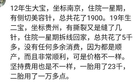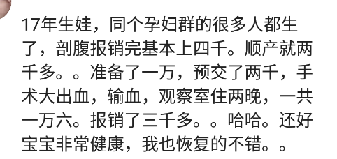 网友b:2000生老大儿子7斤3两,顺产,住四天无痛分娩花了4700。2018生老二女儿8斤3两,剖腹产,住院5天无痛泵花了8800。