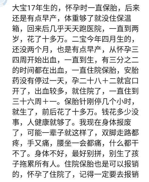 网友c:大宝07年顺产花750,二胎29+4周因为妊娠高血压提前剖(2.4斤没有保住,保温箱住30天,花了五万),三胎龙凤胎产检差不多上万,34+2周因为高血压提前剖,保温箱住16天花了差不多六万(报了差不多三万)。