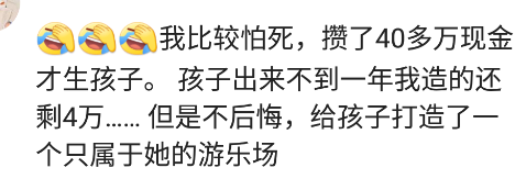 网友a:生二胎兜里本来毫无压力的,结果生前一个月去看了房子,最后还到处借了一大堆钱,生孩子接着借钱。