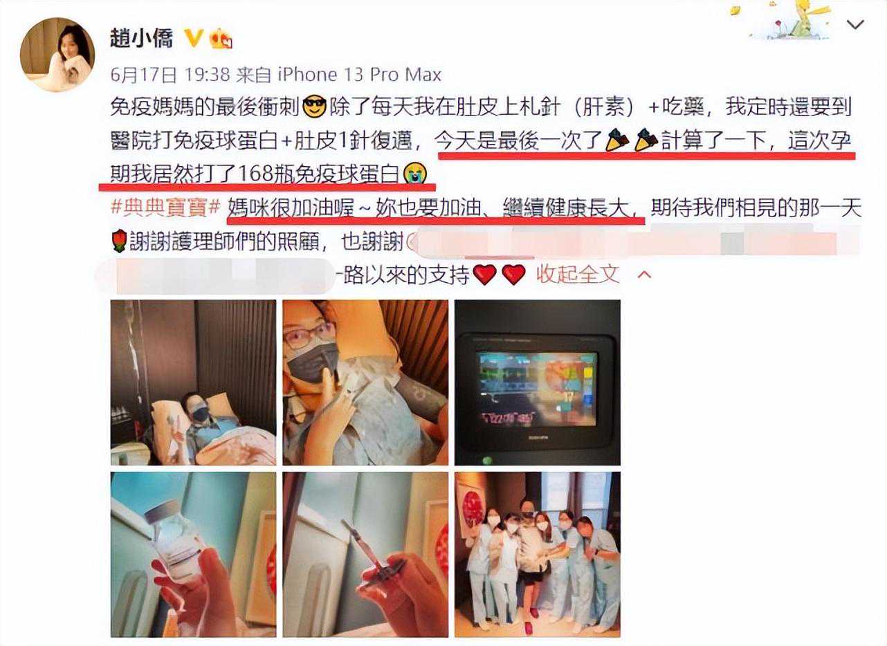 6月17日,台媒报赵小侨是最勇敢的孕妇,肚皮上打满了168瓶免疫球蛋白。