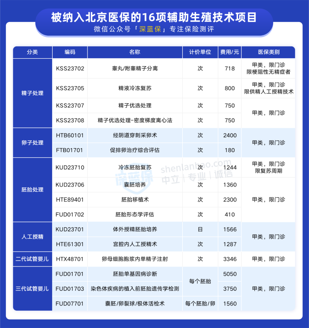 看到表格,这16项辅助生殖技术大多数是手术和实验室项目,不包括检查费和药品费。它们被纳入的是甲类医保,如果是职工医保可以报销70%。