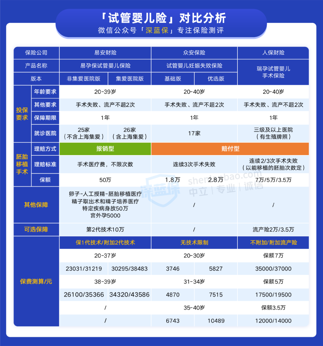 易安易孕保:保额50万,一年内不限报销次数,但保费比较贵,报销下来其实和直接交手术费也差不太多,相当于打了个折,比较适合一年内需要多次手术的朋友。