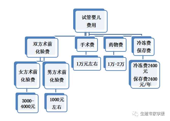 试管婴儿是女方通过促排卵,卵泡成熟后取卵,取卵当天男方取精,卵子和精子在体外受精形成受精卵,进一步发育形成胚胎的过程,整个过程的费用包括:双方术前化验费、手术费、药物费、胚胎冷冻费及保存费。具体如下:
