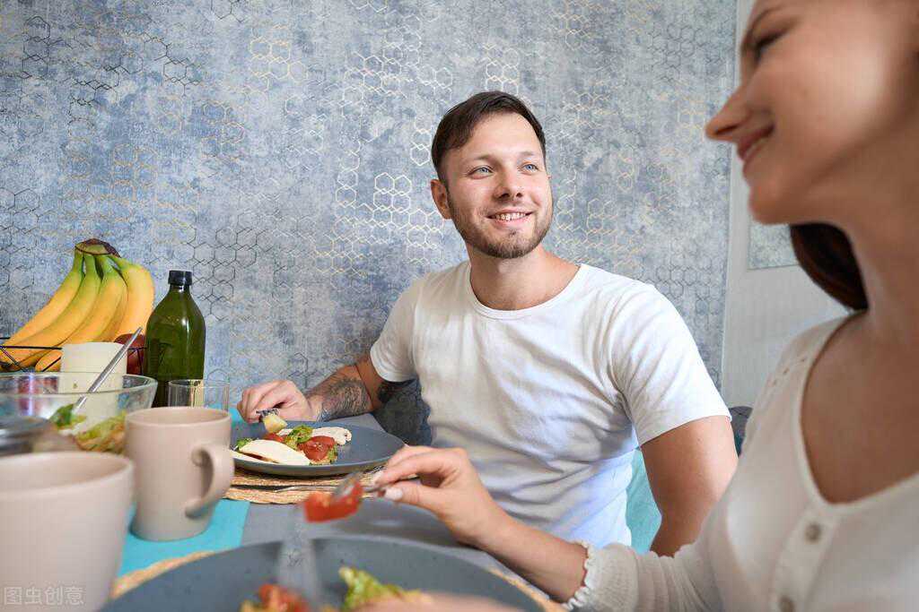 白人丈夫在餐桌上吃盘子里的沙拉时微笑着欣赏他的妻子