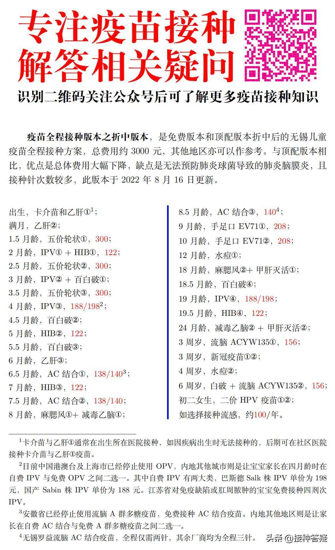 疫苗全程接种版本之折中版本,是免费版本和顶配版本折中后的无锡儿童疫苗全程接种方案,总费用约3000元,其他地区亦可以作参考。与顶配版本相比,优点是总体费用大幅下降,缺点是无法预防肺炎球菌导致的肺炎脑膜炎,且接种针次数较多,此版本于2022年8月16日更新。