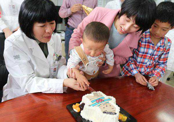 解放军总医院耳鼻咽喉研究所所长王秋菊教授(左一)与聪聪及其家人一起庆贺聪聪周岁生日。罗国金摄