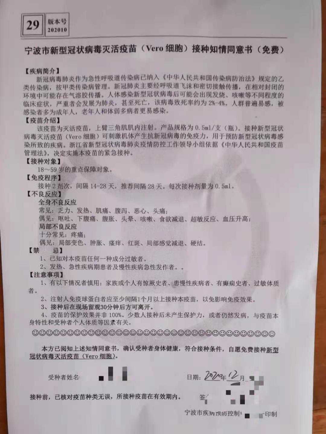 她提供给澎湃新闻的一张《宁波市新型冠状病毒灭活疫苗(Vero细胞)接种知情同意书(免费)》(以下简称“《知情同意书》”)“疫苗介绍”中载明,该疫苗为灭活疫苗,上臂三角肌肌内注射。产品规格为0.5ml/支(瓶)。接种新型冠状病毒灭活疫苗(Vero细胞)可刺激机体产生抗新冠病毒的免疫力,用于预防新型冠状病毒感染所致的疾病。浙江省新型冠状病毒肺炎疫情防控工作领导小组依据《疫苗管理法》,决定实施本疫苗的紧急接种。