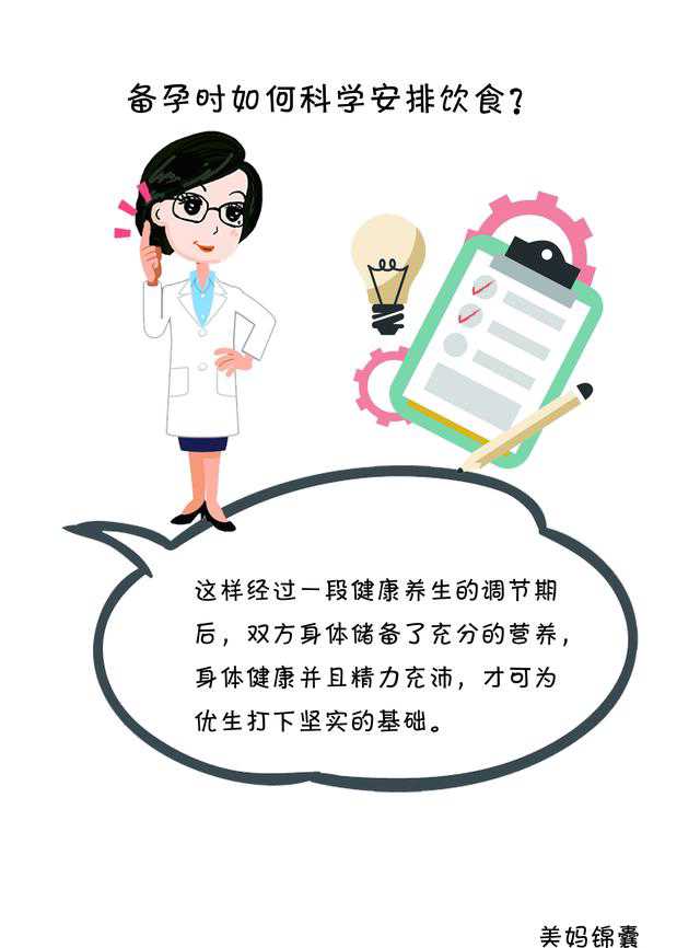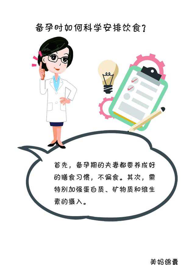 首先,备孕期的夫妻都要养成好的膳食习惯,不偏食。其次,需要特别加强蛋白质、矿物质和维生素的摄入。而且夫妻俩最好都服用叶酸,这样经过一段健康养生的调节期后,双方身体储备了充分的营养,身体健康并且精力充沛,才可为优生打下坚实的基础。