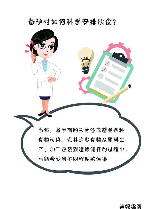 当然,备孕期的夫妻还要避免各种食物污染。在这里说的食物污染,是指从原料生产、加工包装到运输储存的过程中,可能会受到的污染,加之添加剂等化学成分的积累,都会对孕育宝宝产生隐患。因此,应尽量选择新鲜的、天然的食品,避免食用带食品添加剂、色素、防腐剂的食品;蔬菜在买回家后也要充分清洗干净,必要时可以浸泡一段时间后再烹食;家里的炊具应尽量使用铁锅或不锈钢炊具,避免使用铝制品及彩色搪瓷制品,以防止铝、铅元素对人体造成伤害。
