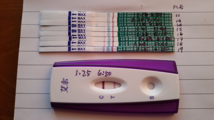 5.排卵试纸,这真是一个找到排卵日的好工具,固定一直用一个牌子,排卵后10-12天左右开始测。我一直用大卫,就能发现最后一次的强阳比以往都要红,从来没有这么红过。