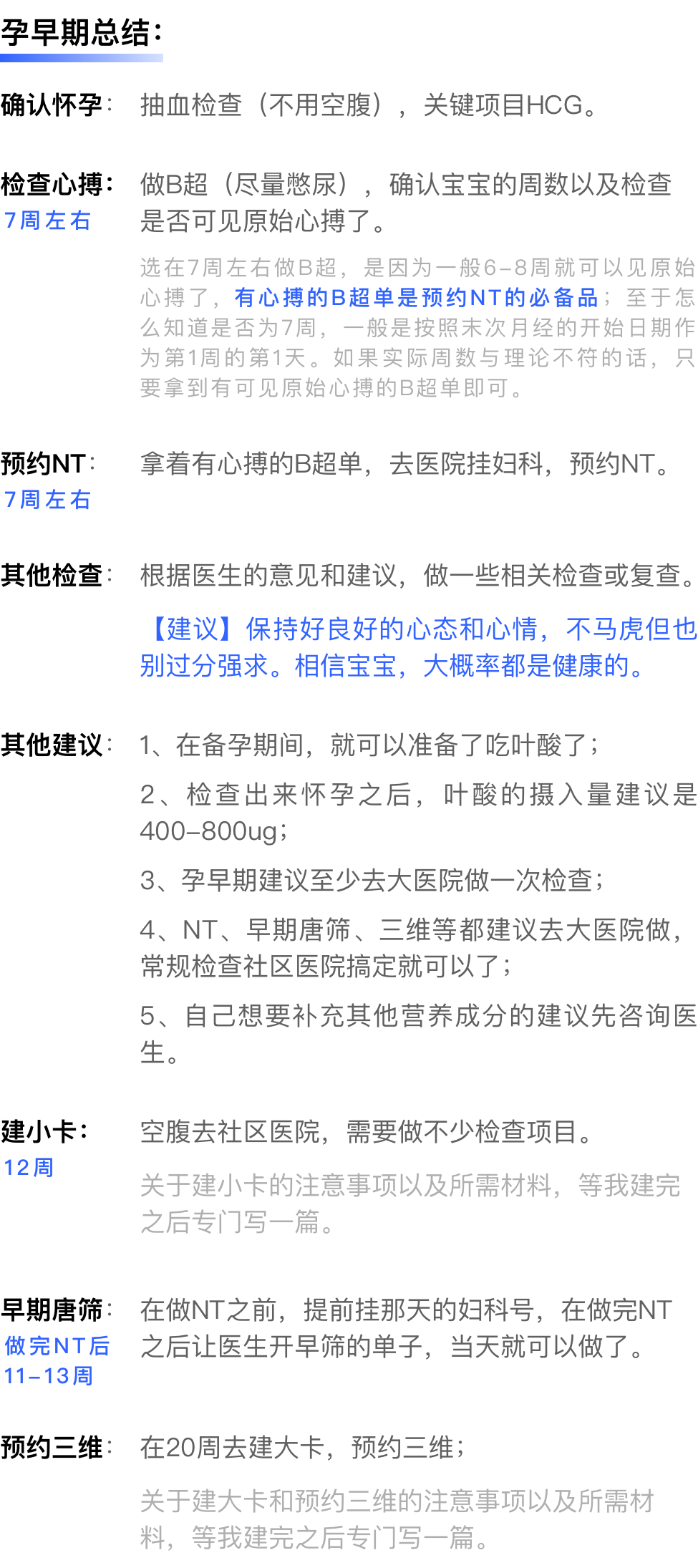 见到医生,医生听到了我的诉求后,说你都11周了,现在检查没有什么意义了。估计是因为即将要做NT和建小卡时候各种检查,但不是想放心一点嘛,不管怎么明示暗示医生,医生还是觉得不用做了。那我白来了?在我来之前,因为我的无知,我查了一下关于NT、早筛、三维什么的检查项目,很多人说NT和早筛要一查出来有胎心就要去医院预约,不然像省妇保根本约不到,只能去其他医院试试。三维有的12周就去省妇保约了,也约不到。额,我现在11周,那岂不是根本没戏。于是乎,我尝试性的问了一下NT、早筛、三维的预约,跟医生说能约哪个就约哪个。医生很明显也觉得我约不上了,就说给我开一个NT的单子去试试吧。说三维在20周的时候去约就好了。早筛我提了,但后来估计聊多了,把预约早筛给略过了。