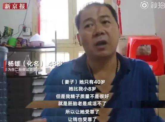 杨雄觉得自己精子质量不是很好,胚胎老是成活不了,夫妻俩已经是第五次来做手术了,这一次次手术做下来不仅妻子受罪,钱也受罪。每次取卵后杨雄都会觉得妻子又苍老了一些,而且杨雄过来取精后就要马上回去想办法筹钱,他们生二胎做试管婴儿的目的是不想去养老院,因此希望能多生一些孩子,能在将来自己老了之后能照顾他们。