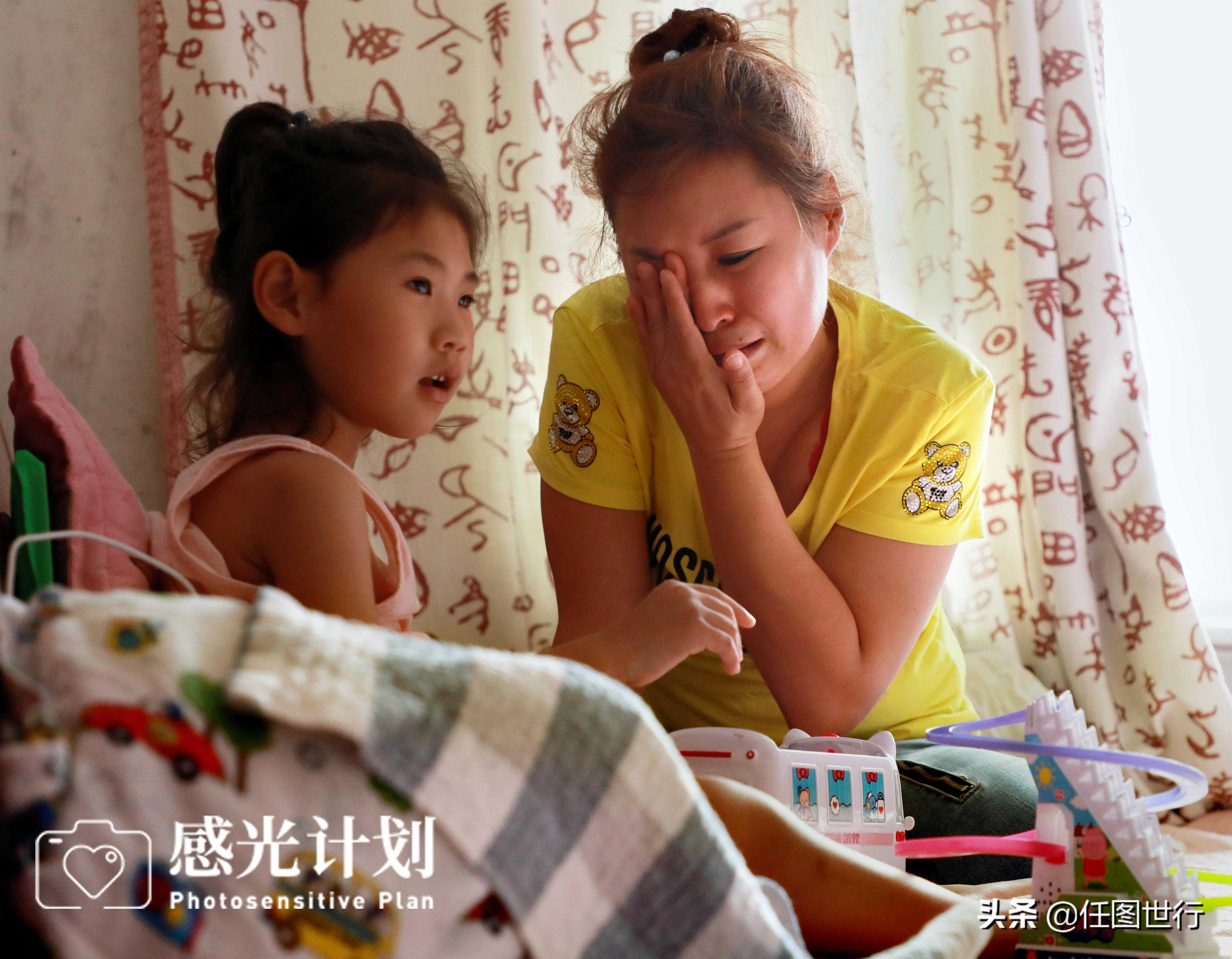 离婚后,王艳清和患病的大女儿和上幼儿的小女儿留住在离婚时留给她四十平的小屋里相依为命,每天除照顾孩子之外,就是四处求人筹钱为大女儿的康复治疗费忙碌不休。王艳清借遍了所有亲朋好友,报道了王艳清的家庭遭遇和两个女儿的故事后,筹了部分钱,延续着徐嘉雯的生命。图为提到这几年的生活不易,王艳清不由自主的和女儿抱头痛哭起来。