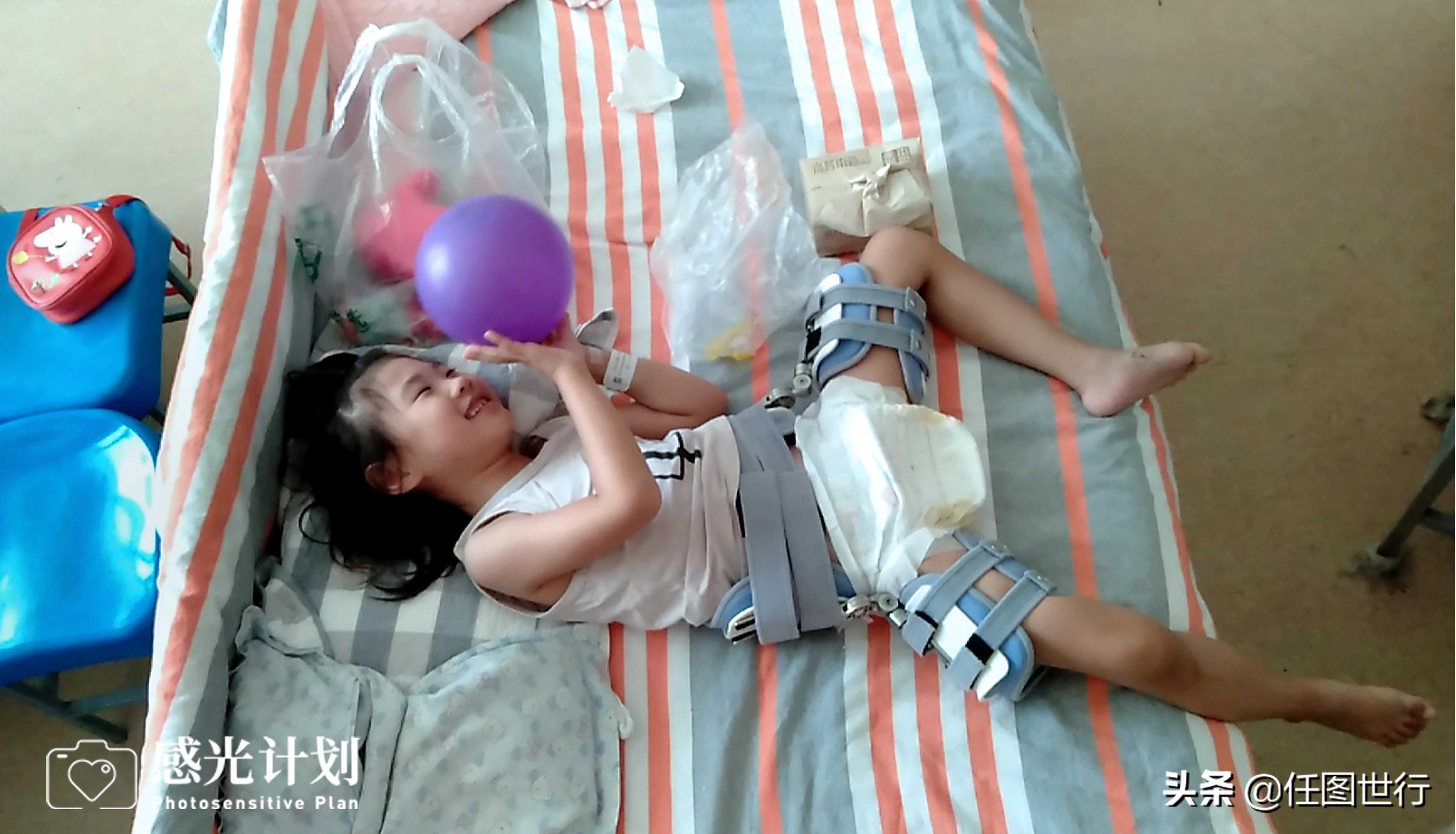 徐嘉雯和病魔斗争了整整6年,妈妈王艳清最大的心愿就是希望女儿有天能够和正常人一样行走。而为了这个目标,2019年8月23日,王艳清贷款在位于沈阳市中国医科大学附属盛京医院为徐嘉雯做了内收肌松解手术。医生说,如果想要继续恢复,就要在半年后继续做髋关节半脱位手术,这样孩子才能有行走的希望。图为徐嘉雯在手术后在病床上玩耍。