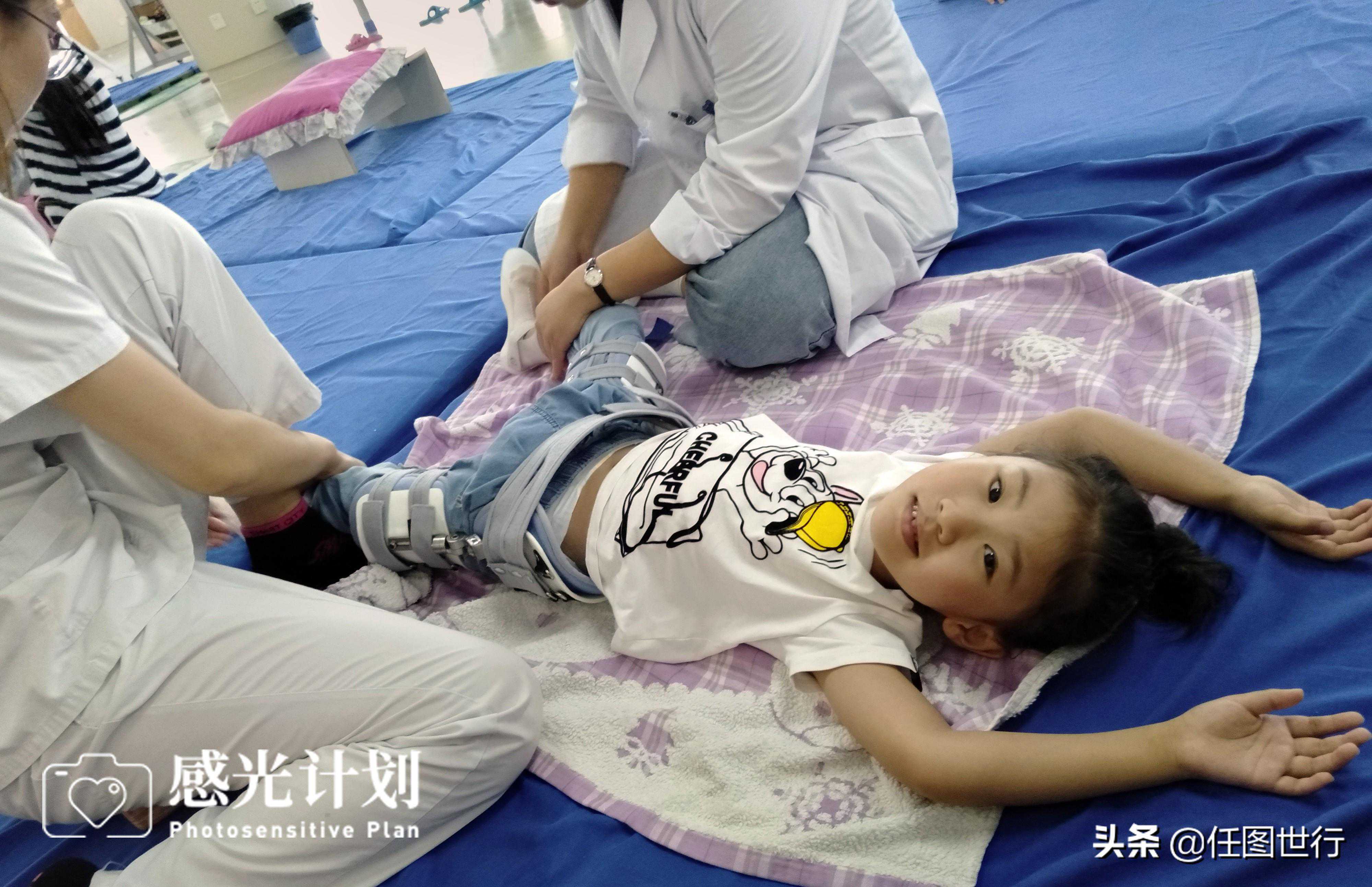 两个半月的治疗,医院为徐嘉雯进行核磁检查时又查出脑积水,在脑炎排毒治疗四个多月后,徐嘉雯进行了脑室引流手术。孩子从出生到保温箱抢救、到查出脑炎和脑积水,手术治疗费用高达42万,对于以打工为生的家庭来说,几十万元的治疗费最终导致整个家庭一贫如洗。脑炎引起的小脑萎缩,影响四肢运动和语言功能,几年的治疗孩子现在才能简单说两个字,但还不能行走。图为如今6岁的徐嘉雯在手术后康复治疗。